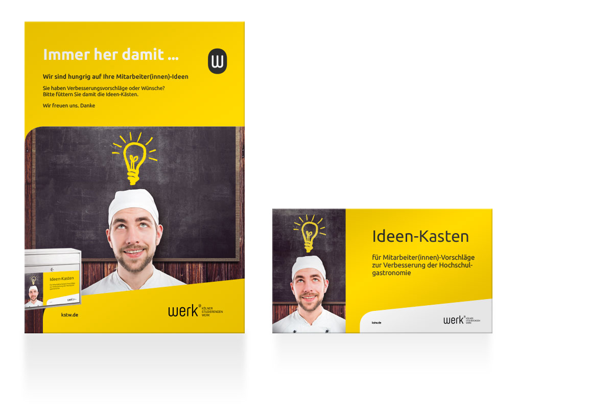 15.12.2016 Leben – Lachen – Lernen unter einen Hut zu bringen, das ist eine echte Herausforderung in einer Studien-, Medien- und Kulturstadt wie Köln. Das Kölner Studierendenwerk betreut 83.000 Studierende von sieben Kölner Hochschulen. Es betreibt Mensen, Studentenwohnheime und Beratungsstellen rund ums Studium. Das Schild weist auf die Ideen-Kästen des Studierendenwerks hin, die von den Mitarbeitern mit Vorschlägen für Verbesserungen oder Wünschen gefüllt werden sollen.