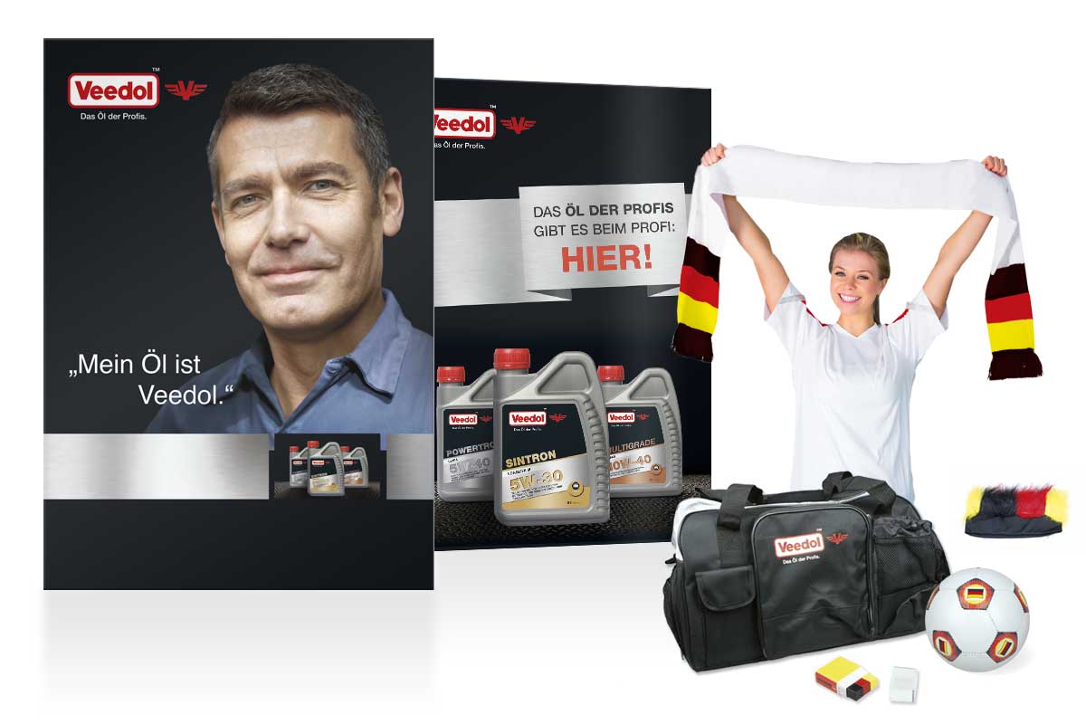 18.05.2016 Zur Europameisterschaft 2016 in Frankreich, gab es für die Autohäuser und Fans Service- und Dekorationspakete von Veedol Deutschand. Das Veedol-Service-Paket beinhaltete Nachfülltaschen für die 1-Liter-Dose, Serviceposter und das Vintage-Veedol-Schild aus Blech. Das Dekorations-Set bestand aus Deutschland-Schal, Fanschminke, Fußball und Stirnband.